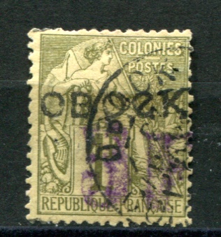 OBOCK SG.49 1892 5F on 1fr olive-green (CDS) EOR. Few trimmed perfs top left but fair example of this