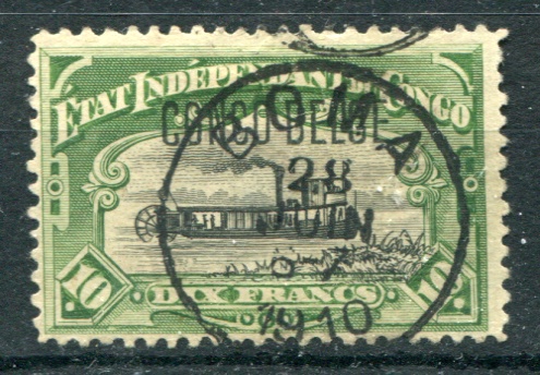 BELGIAN CONGO SG.55b 1909 10fr black & green perf 12 Riverboat (Fine BOMA CDS) Tiny thin at