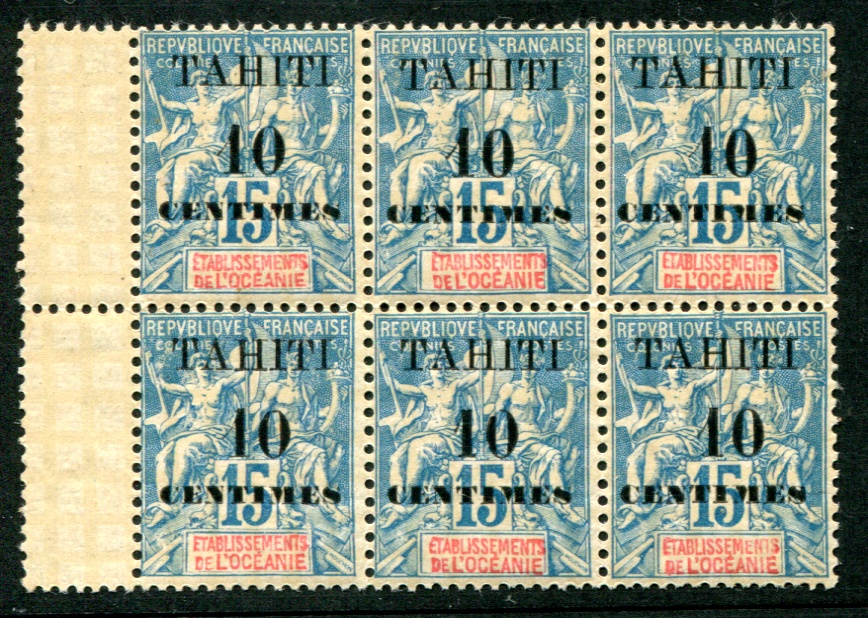 TAHITI SG.57 1903 10c on 15c blue in superb UM marginal BLOCK of SIX Cat.£63++